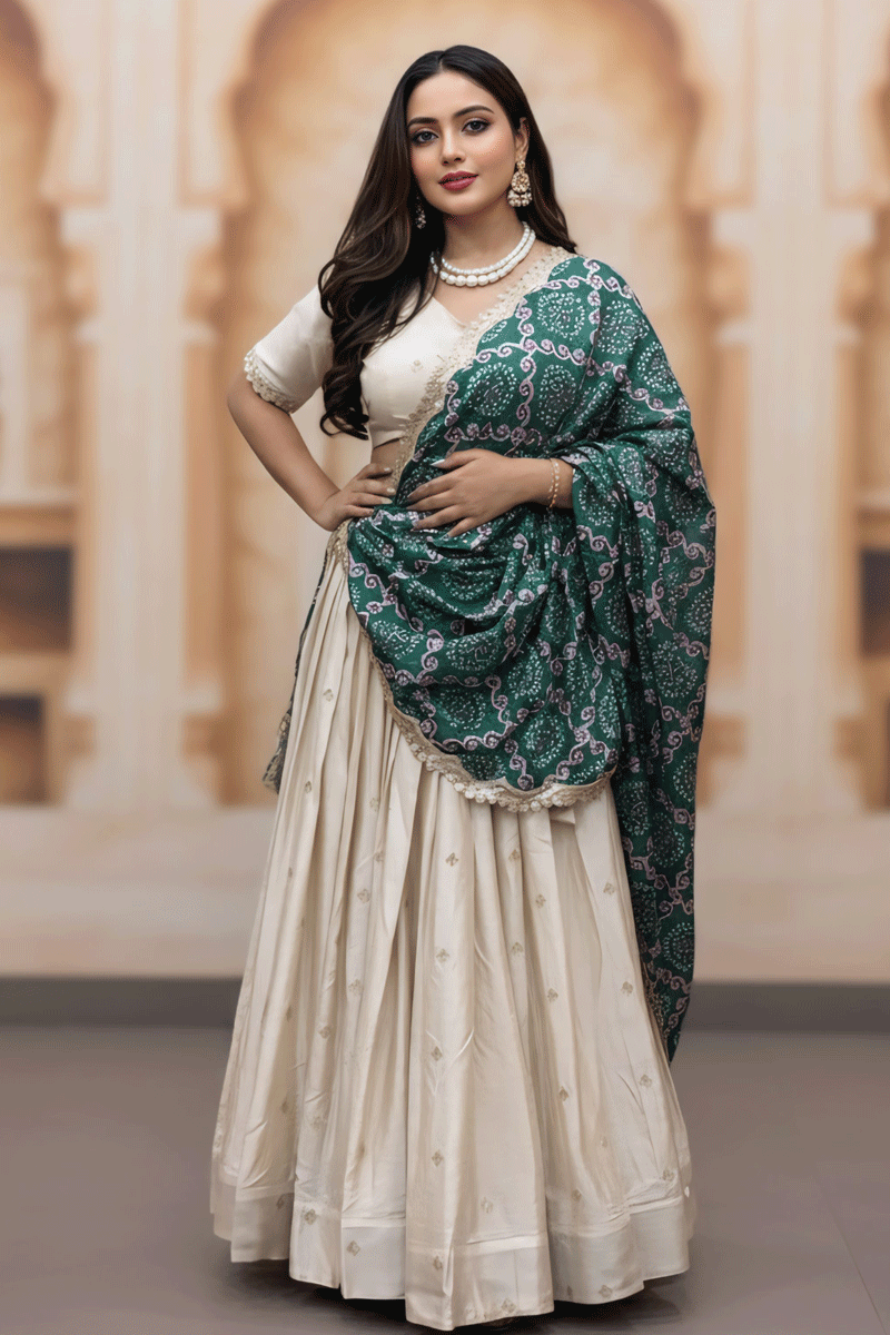 Off-White Color Lehenga Choli With Green Bandhani Print Dupatta For Wedding From Anaya Designer Studio ...