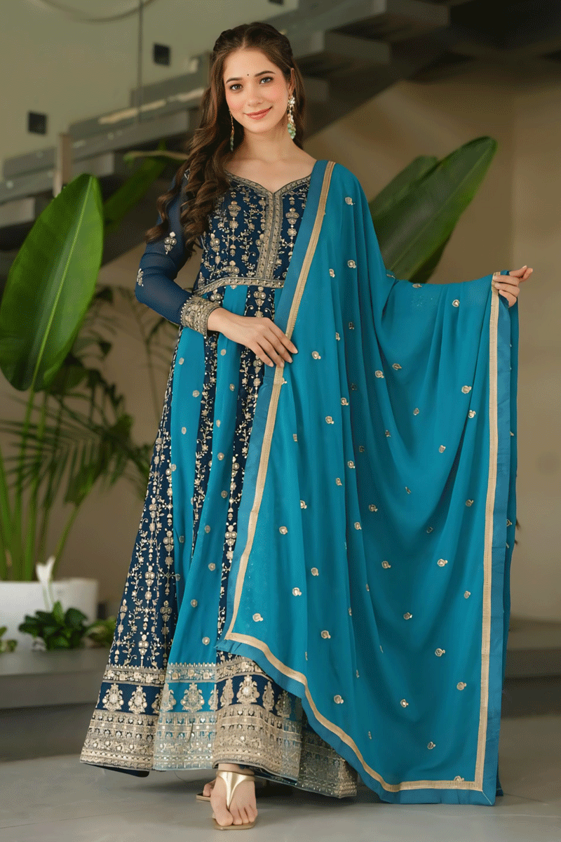 Teal Color Anarkali Suit For Sangeet Function From Anaya Designer Studio ANARKALI• Fabric: Faux Georgette•...