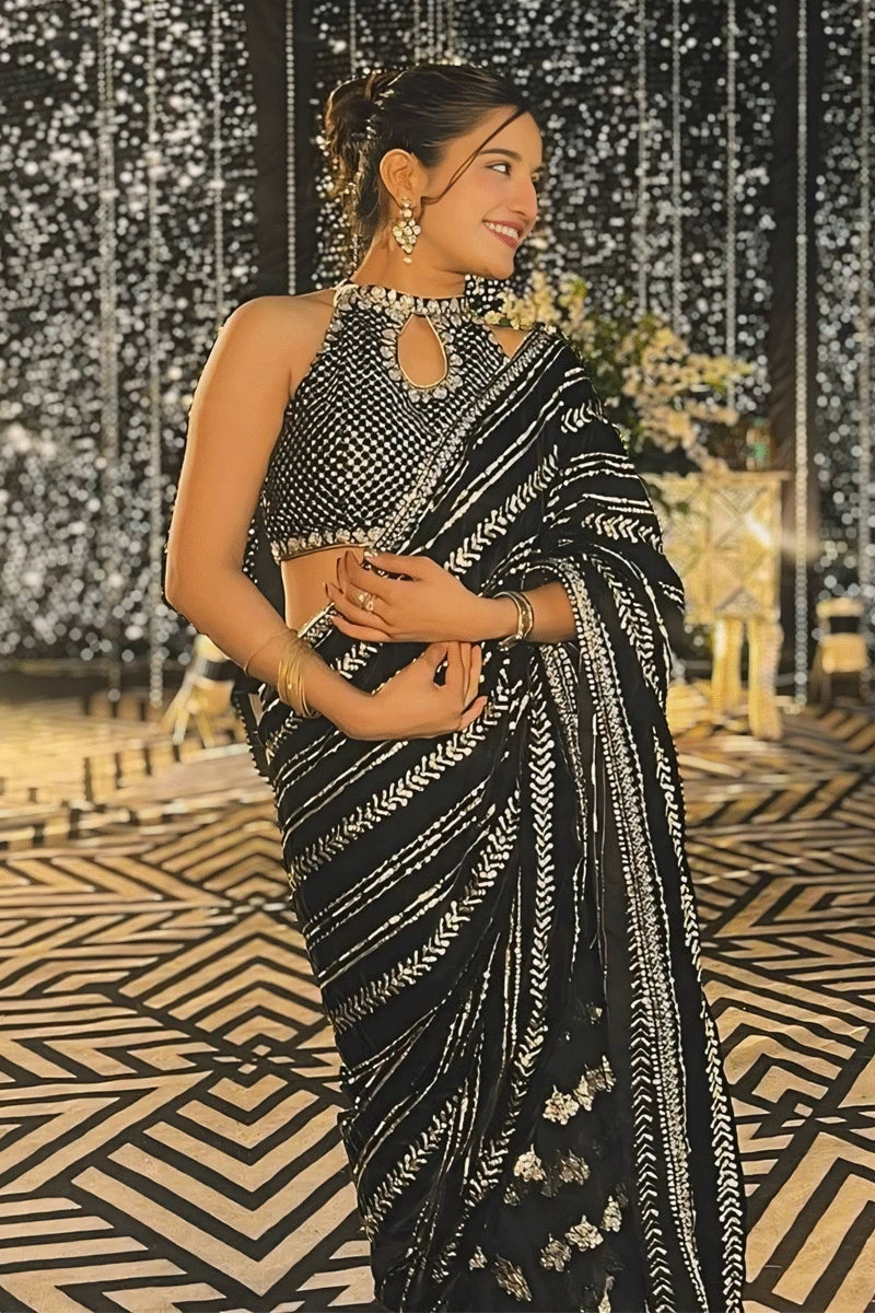 Designer Black Golden Sequence Work Saree For Sangeet