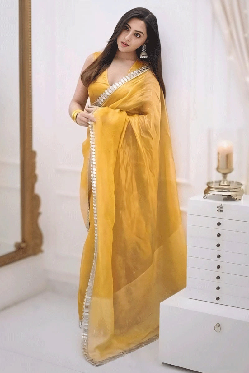 Beautiful Golden Saree With Stitched blouse For Wedding Function
