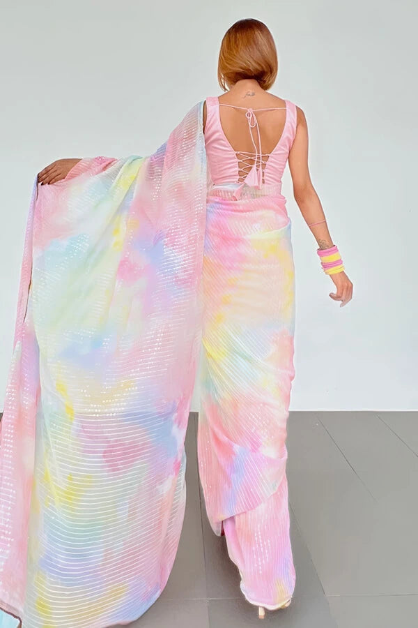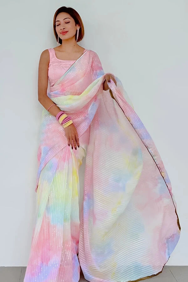 Get The Latest Isha Borah Pre Stitched Saree Online For Girls That Comes With Heavy Georgette Fabric With Beautiful Digital Print.