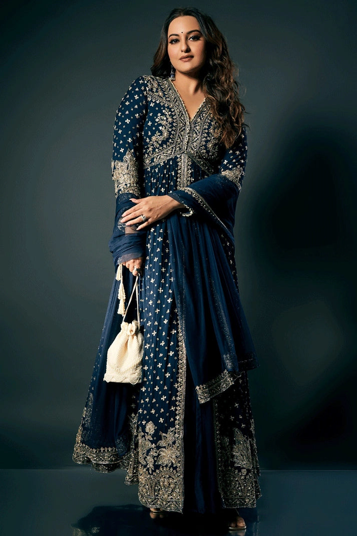 Indian Actress Sonakshi Sinha Blue Colour Embroidery Work Gown Outfit For Wedding From Anaya Designer Studio