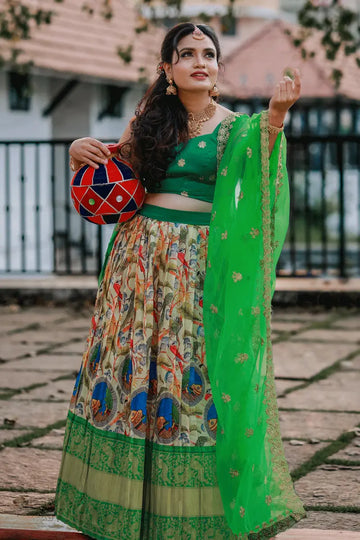 All New Traditional Animal Printed Half Saree For Girls Made With Jacquard Banarasi silk saree with Embroidered Dupion Silk Blouse Design.