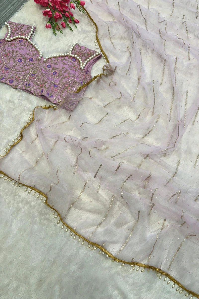 - Fabric: Premium soft butterfly net adorned with intricate sequins and hand-embroidered pearl work.