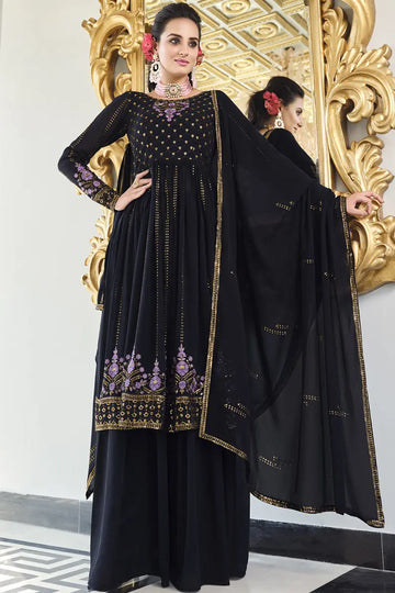 Introducing the epitome of sophistication and charm, the black Georgette Thread and Sequence Embroidery Work Sharara Suit. This exquisite ensemble is designed to elevate your style quotient and make a bold statement at any special occasion.