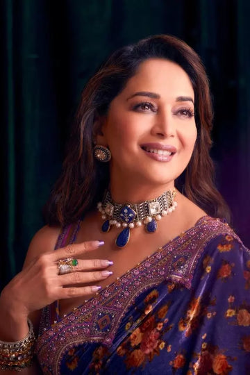 - Work: This Madhuri Dixit Saree features beautiful Digital Print, Embroidery Work, and Real Mirror Work. There is also heavy Moti Lace border work.