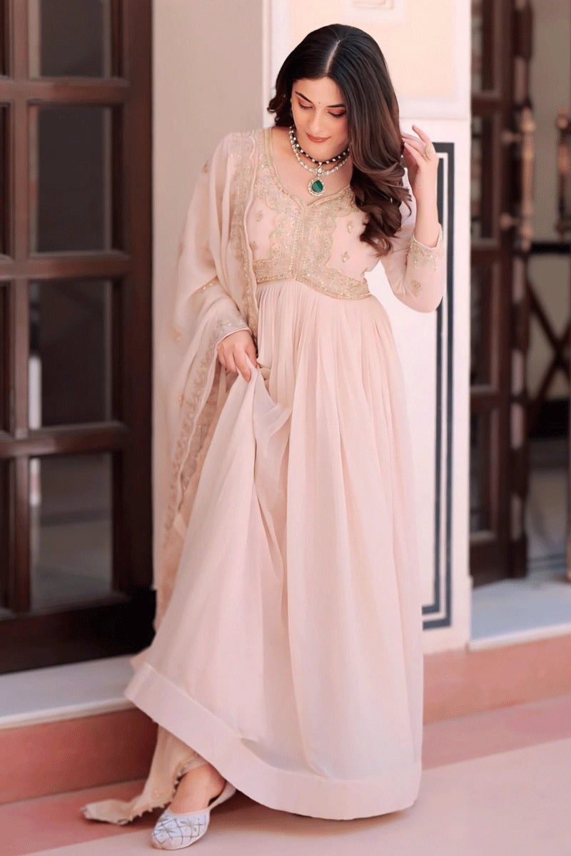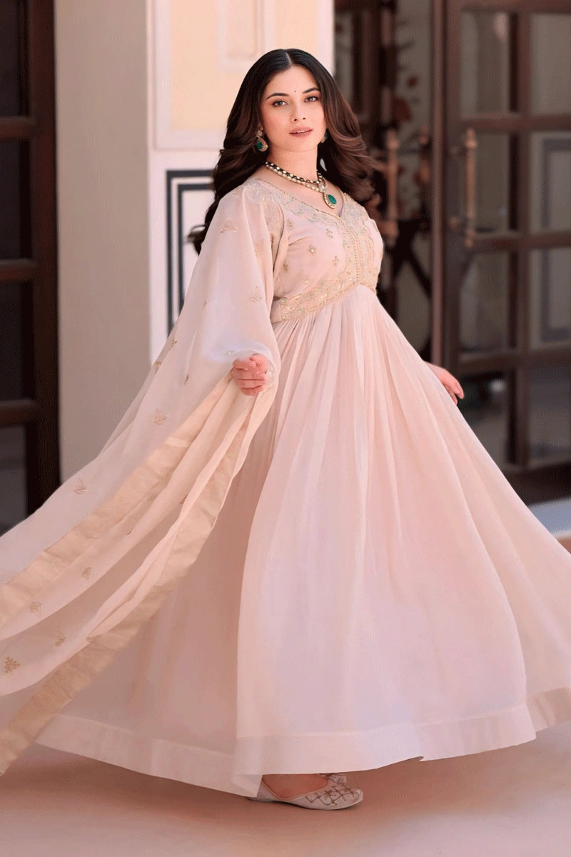 Cream Color Embroidery Long Gown For Diwali