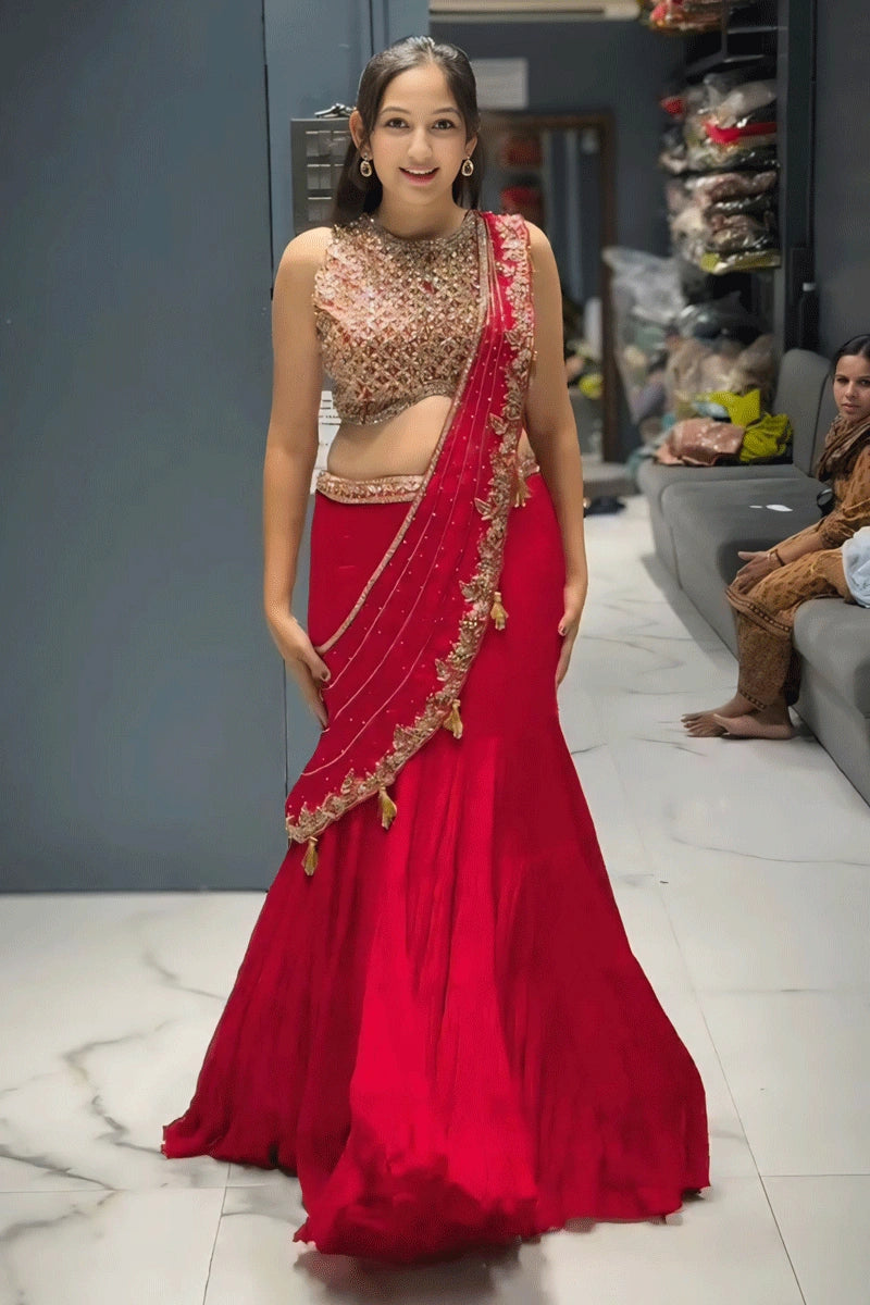 New Designer Red Pre Drapped Lehenga Saree For Party Wear From Anaya Designer Studio