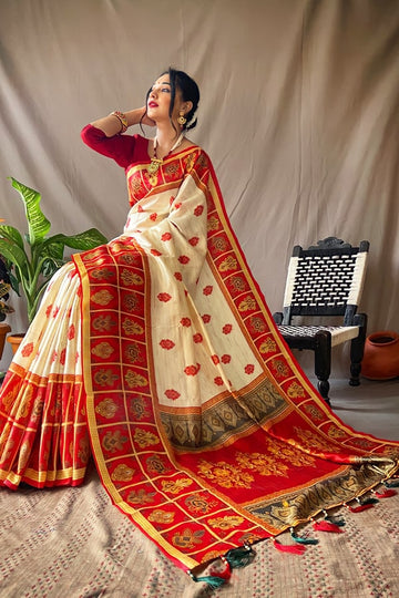 Pure Zoya Silk Saree With Ethnic Durga Pooja Combination of White & Red With New Tassels Concept With Contrast Blouse.