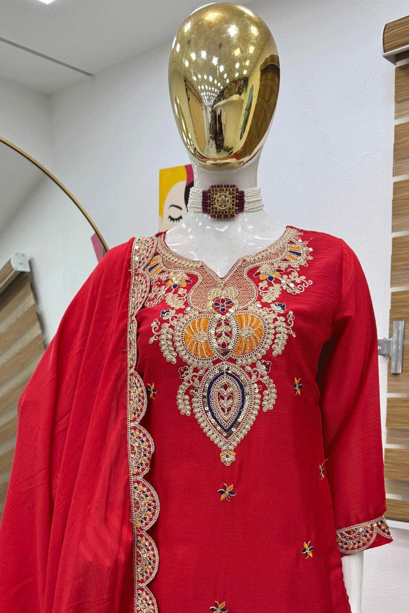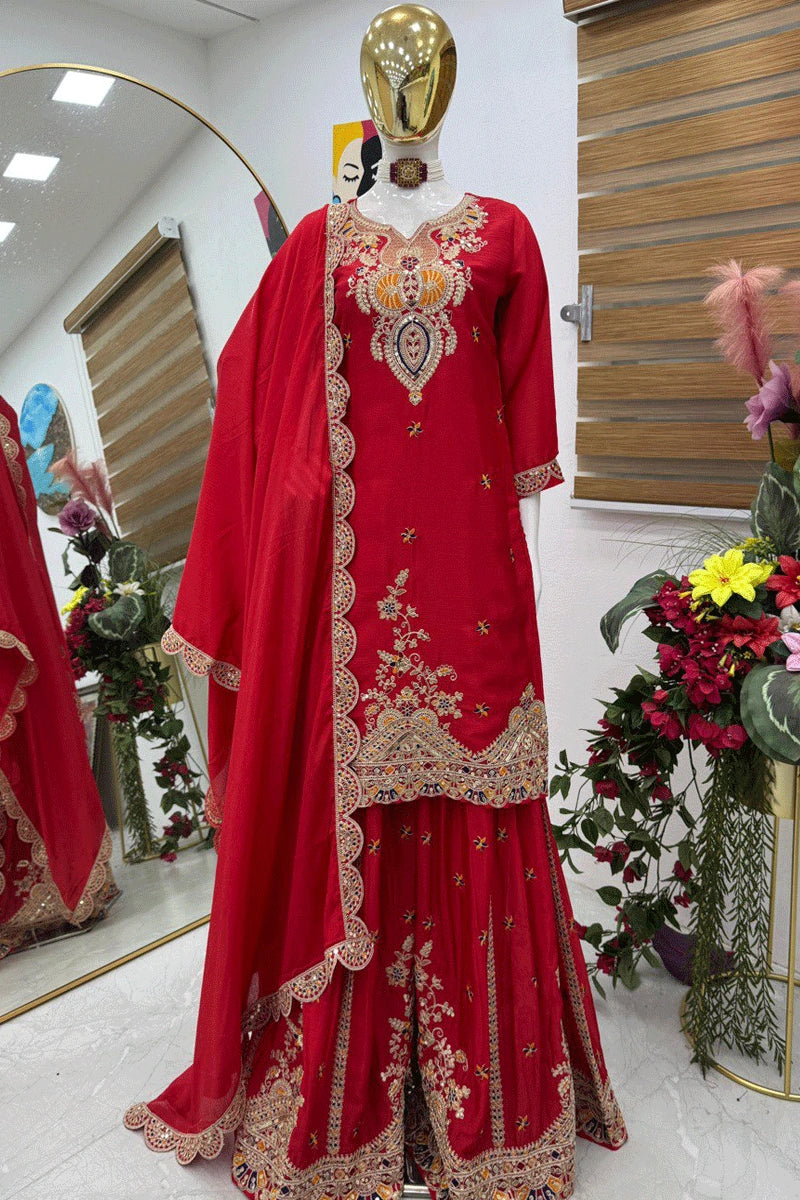 Embroidery Work Red Color Sharara Suit For Wedding