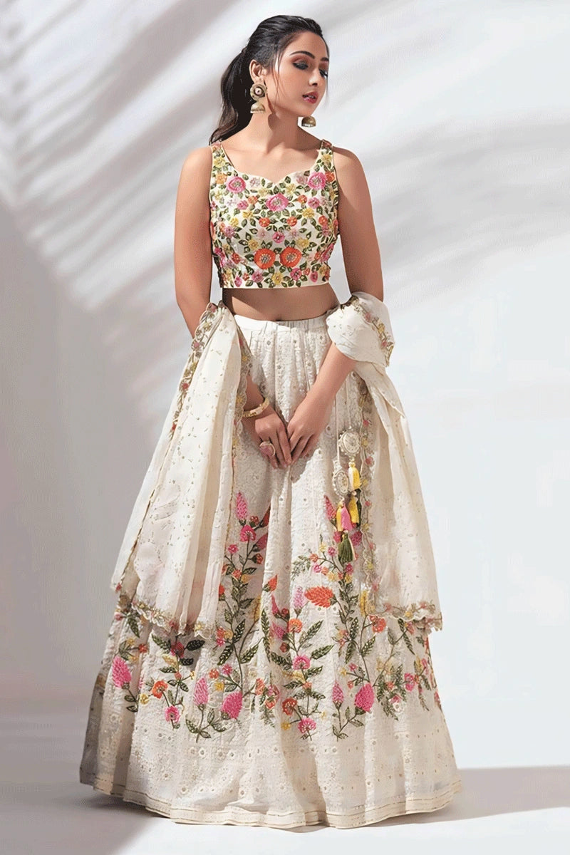 New Traditional Embroidery Work White Engagement Lehenga For Bridal From Anaya Designer Studio