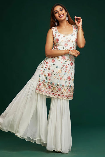 Category: Bollywood Dresses | Dhoti Style Crop Top DressThis sage white sharara suit in Georgette with embroidery and sequence work. It is crafted with a round neckline and full sleeves. A matching net dupatta with a similar embellished border completes the classic look.Related: Fancy Stylish Embroidery Sharara Suit Design 2022 | Punjabi Sharara Suit For Party Wear| Traditional Punjabi Sharara Suits For Wedding | Simple Sharara Suit Design| Modern Sharara Suit | Party Wear Punjabi Sharara Suits