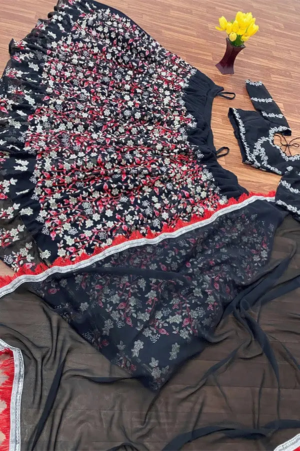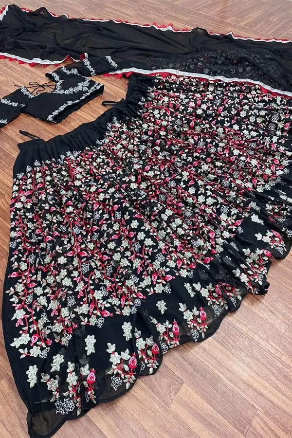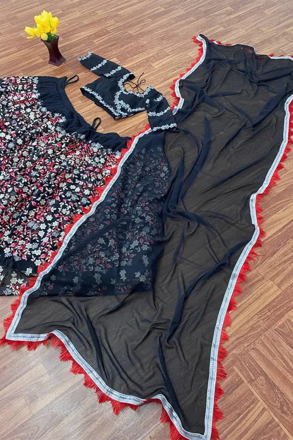 Georgette black crop top lehenga" is a traditional Indian garment consisting of a blouse (the "Crop top") and a skirt (the "Lehenga") made of georgette fabric, which is a lightweight, sheer, and flowy material. The color black is a popular choice for formal occasions and is often paired with traditional Indian jewellery and accessories.