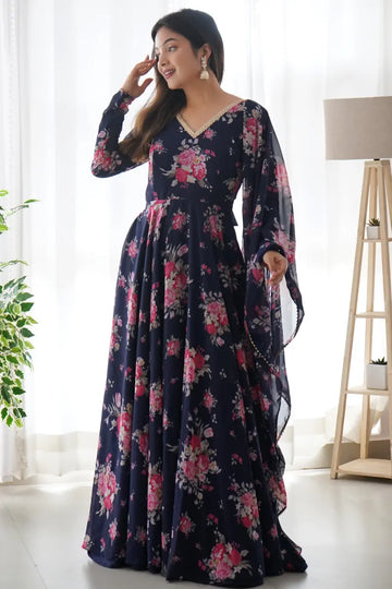 Indian Ethnic Wear Long Anarkali Navy Blue Floral Print Gown For Raksha Bandhan That Comes With Tabby Georgette Fabric Fully Flair Kali Pattern With Dupatta.