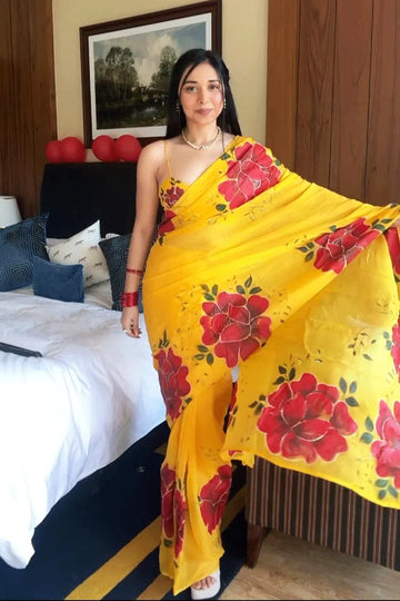 New Arrival Yellow Color Digital Taby Silk Ready To Wear Party Wear Saree For Farewell Party