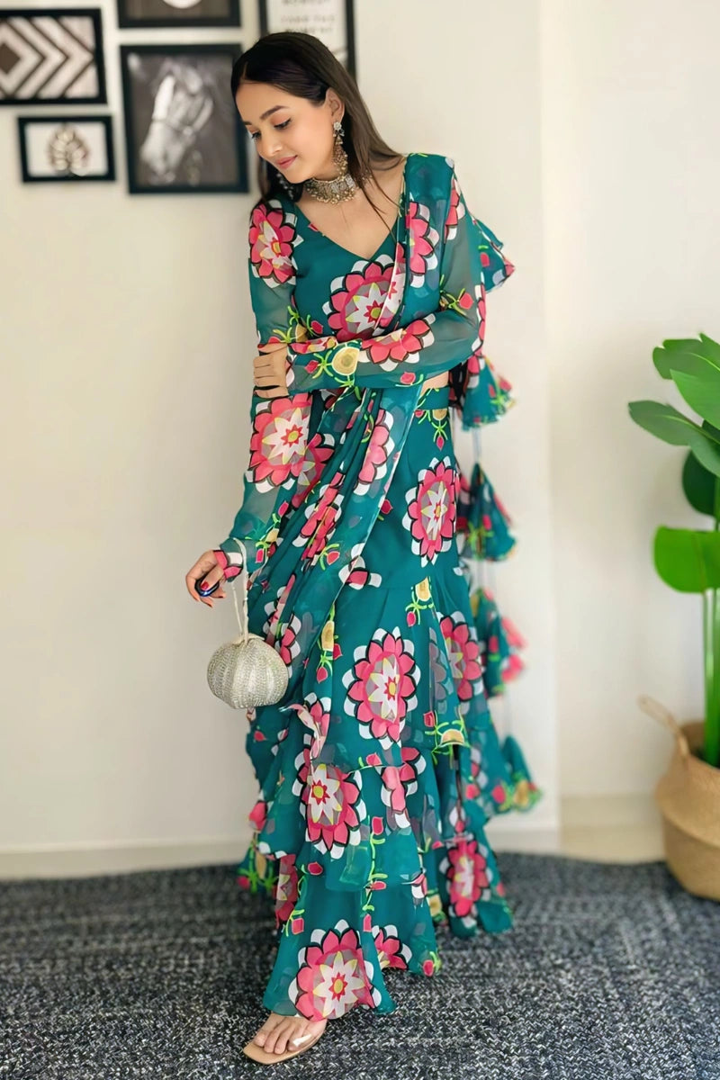 Flower Print Ruffle Ready To Wear Lehenga Saree