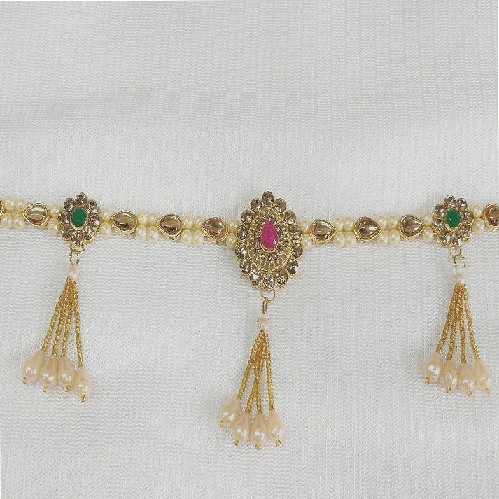 Design: Elegant traditional waist belt featuring intricate motifs adorned with red and green stones.