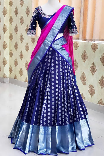 This Dark Blue and Pink Combination Half Saree Lehenga is something that you should bookmark.