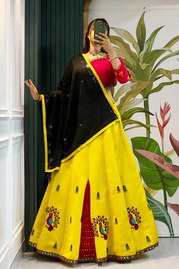 New Arrival Yellow Color Cotton Silk Stitched Heavy Flair Chaniya Choli For Navratri 2024