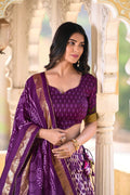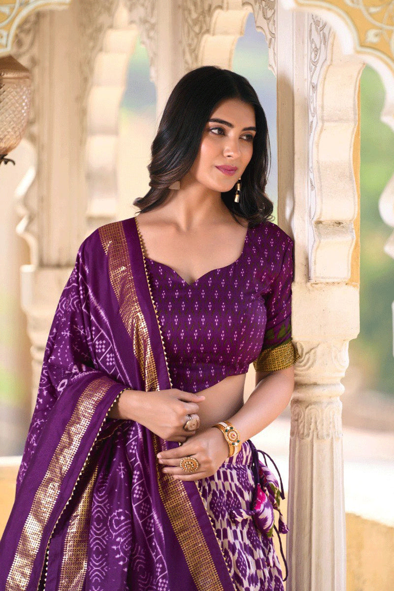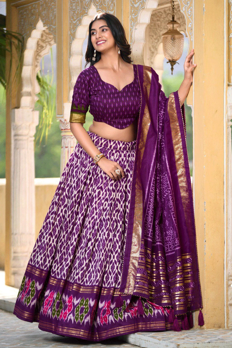 Celebrate Garba in a heavy flare purple lehenga choli. This elegant and vibrant outfit is perfect for Navratri, blending tradition with modern design for a stunning festive look.