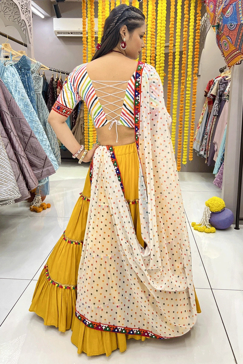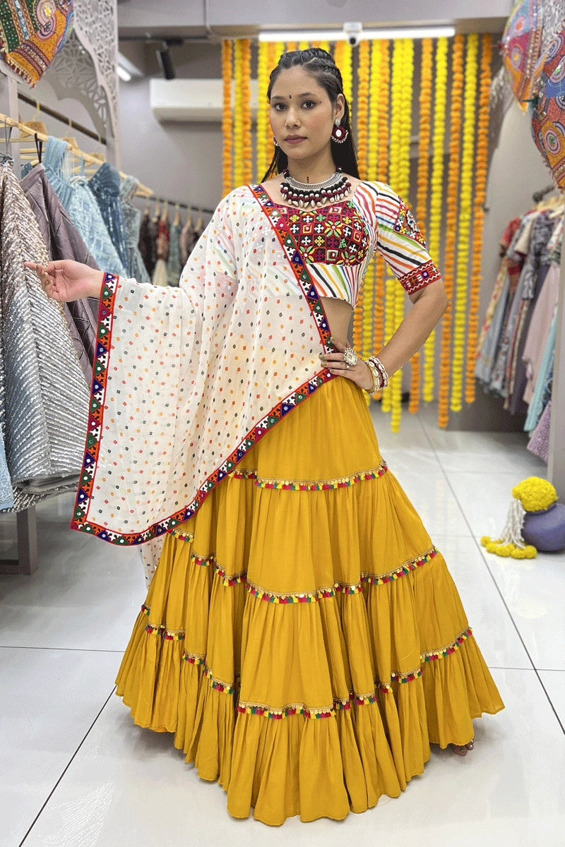 New Arrival Traditional Heavy Flare Yellow Lehenga With Gamthi Work In Blouse For Navratri