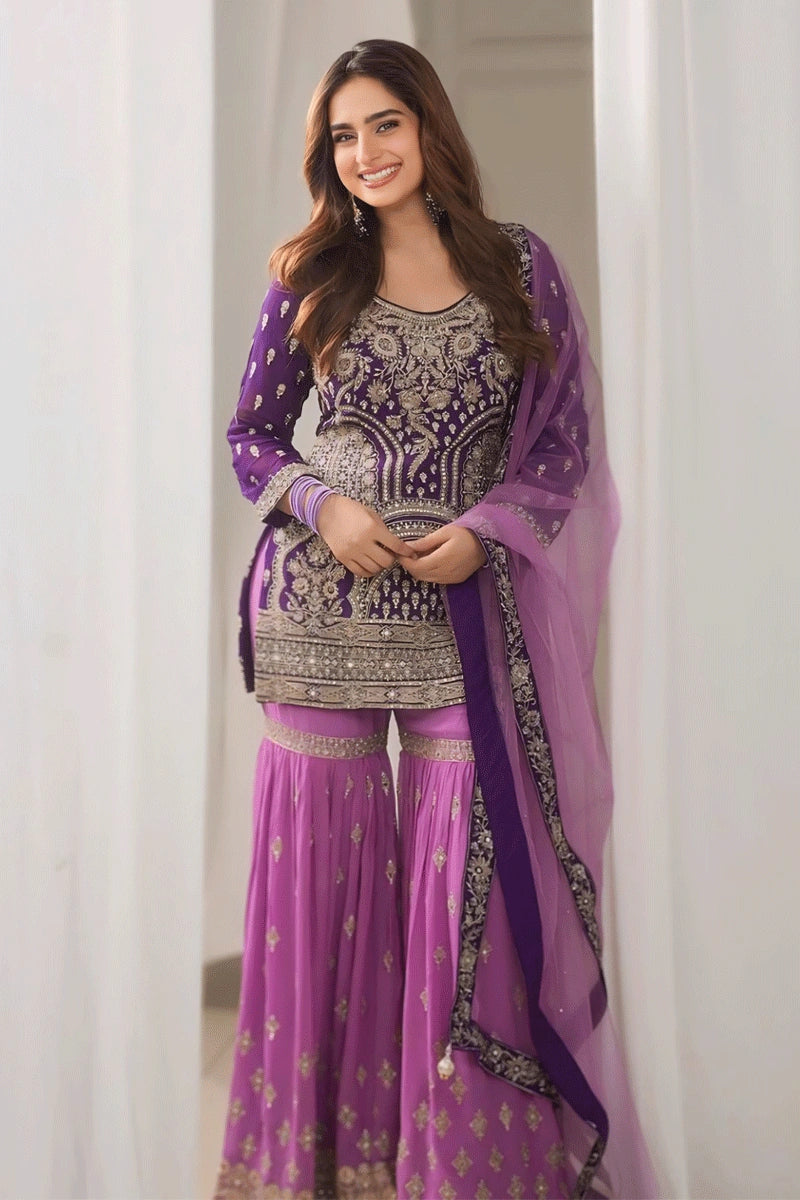 New Indian Actress Ayesha Khan Purple Sharara Suit From Anaya Designer Studio