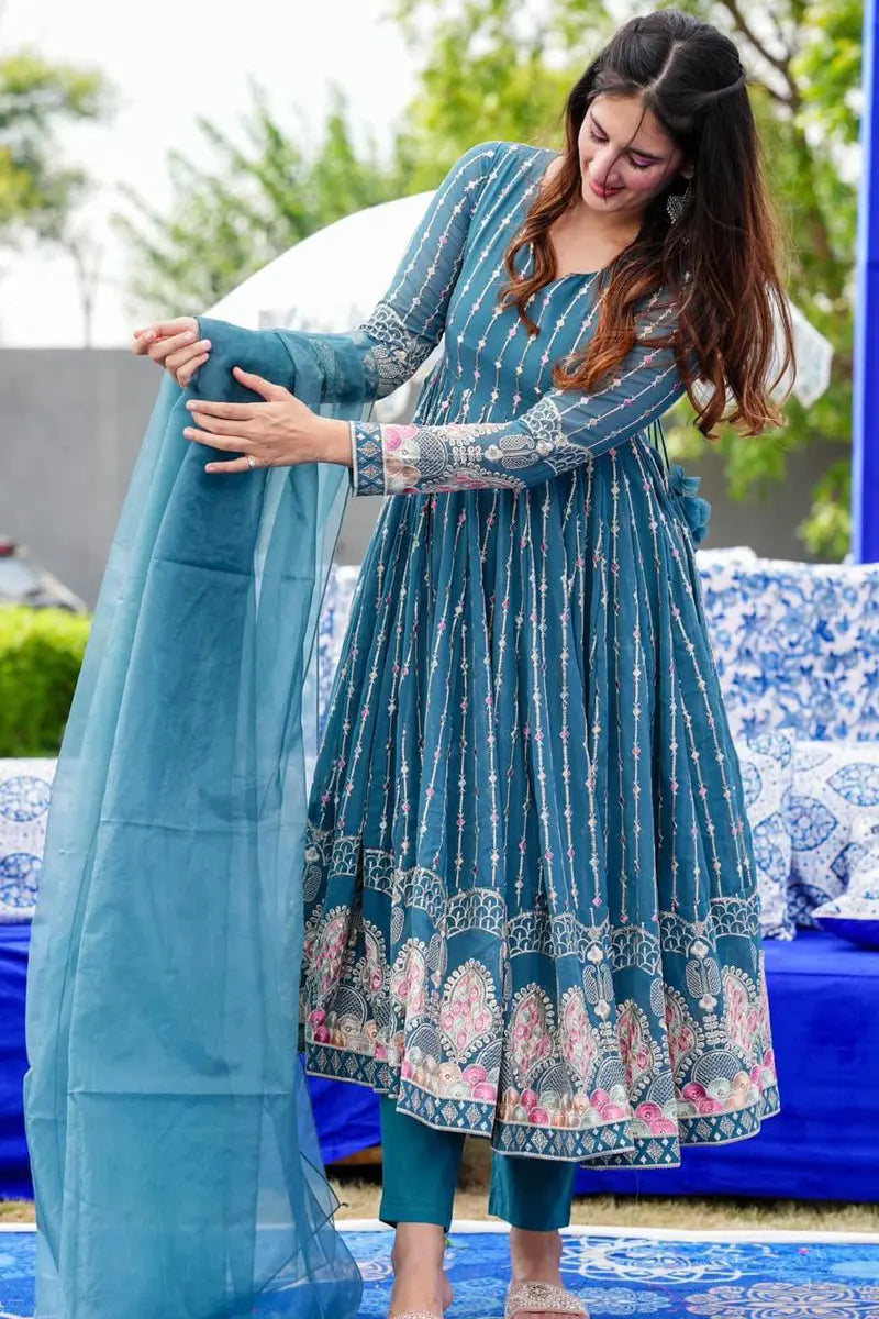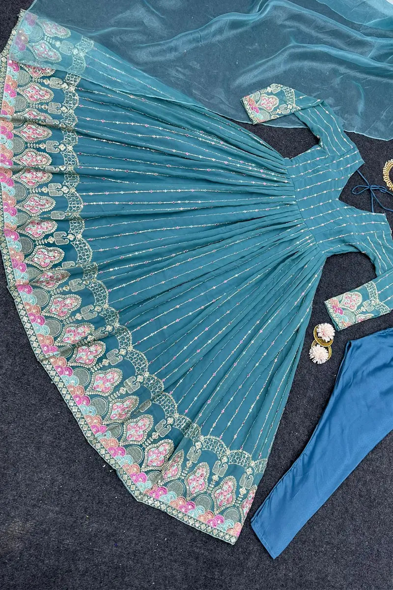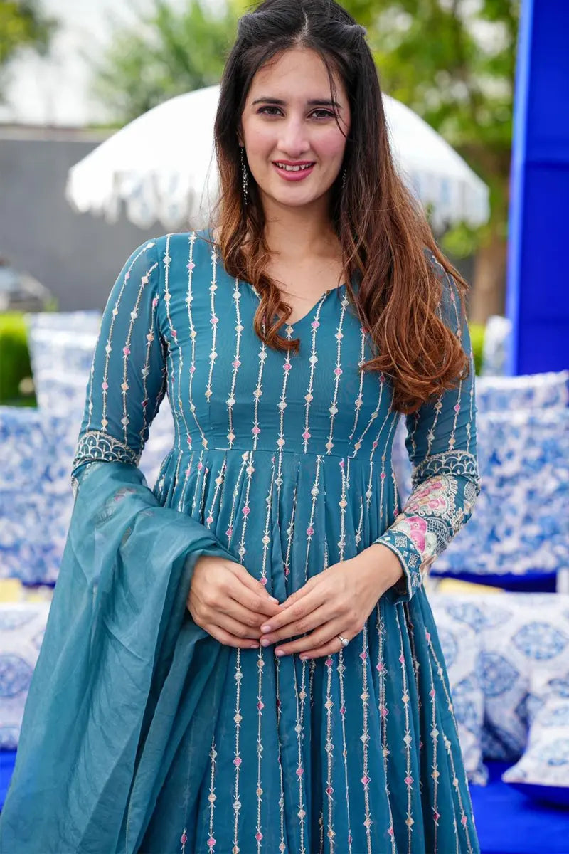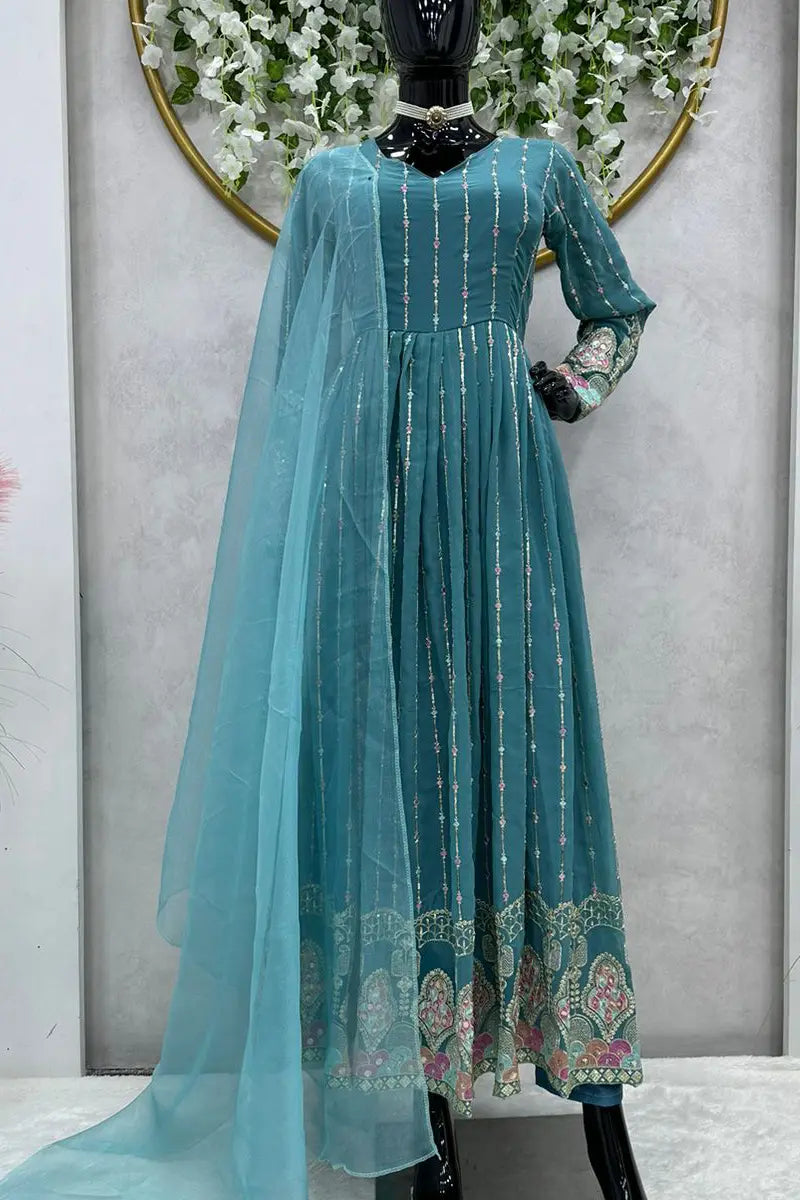 Discover the perfect Raksha Bandhan gift for your beloved sister at Anaya Designer Studio! Our exquisite sky blue gown dress is the ideal choice to make her feel cherished on this special occasion. The sky blue color exudes elegance and charm, making it a stunning outfit for the festivities.