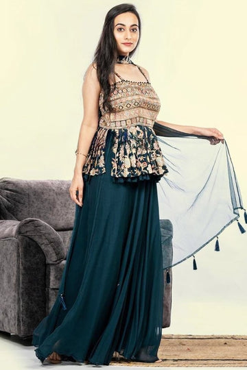 Get The Latest Sharara Suit With Peplum Top For Girls That Comes With Georgette With Heavy Embroidery Work Design.