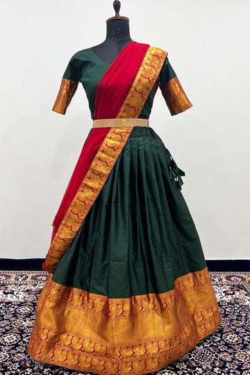 Get The Latest South Indian Trending Half Sarees For Girls That Comes With Kanjiveram Silk Zari Lehanga With Blouse Along With Banarashi Silk Duppta.
