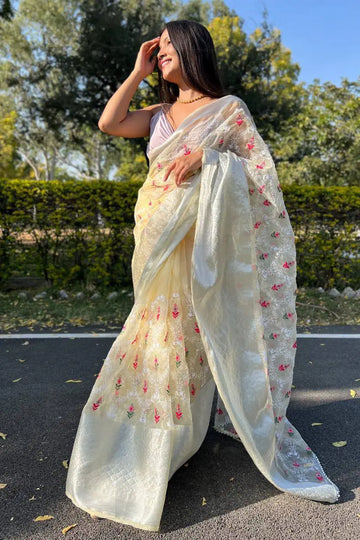 New Arrival Organza Saree To Give Long Lasting Impression In Wedding With Light Yellow Organza Saree For Girls With Fully Thread Embroidery Work At Anaya Designer Studio.