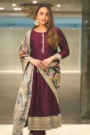 Traditional Maroon Full Sleeve Gown in Full Heavy Embroidery Sequence Work with Multi Colour Dupatta