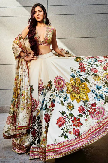 The mesmerizing digital print on the lehenga boasts intricate detailing that captures the essence of Indian heritage. The vibrant colors and artistic motifs create a visual symphony that's sure to turn heads. Complementing this masterpiece is the carefully handcrafted real mirror work that adds a touch of glamour and sparkle to your ensemble.