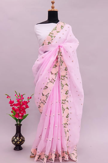 Get The Latest Modern Designer Saree For Wedding Guests Made With Pure Organza Silk With Full Flower Embroidery Work Design.