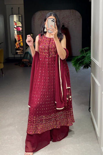 The fabric used for the Naira Kurti is typically rich and luxurious, such as silk, chiffon, or georgette. These materials drape beautifully and enhance the overall elegance of the design. The color palette for Karwa Chauth Naira Kurtis often includes vibrant hues like deep red, maroon, royal blue, or emerald green, symbolizing love, passion, and prosperity.