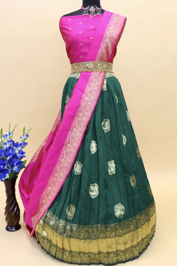 In the rich tapestry of South Indian culture, the Narayanpet silk saree stands as a symbol of timeless beauty and heritage. Among its mesmerizing variants, the dark green Narayanpet silk saree adorned with a captivating pink dupatta stands out as a stunning example of traditional craftsmanship and artistry.