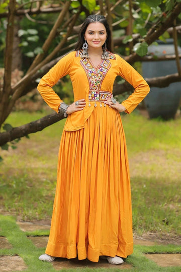 Navratri Special Gamthi Work Full Sleeve Yellow Gown | Navrati Special Yellow Gown For Women | Kutchi Gamthi Work Gown | Traditional Gown For Women | Koti Style Gown | Festive Gown | Indian Traditional Wear | Rayon Gown | Full Sleeve Gown For Women