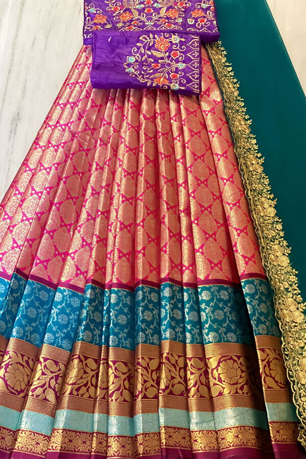 This Stunning six-yard beauty is a serene half saree blouse design that is skillfully made with Kanjiveram Silk Zari Work. We have poured all the love into careful Weaved the Pink and purple combination half saree for girls for is paired with a matching Blouse and Dupatta in Soft Net weaving.