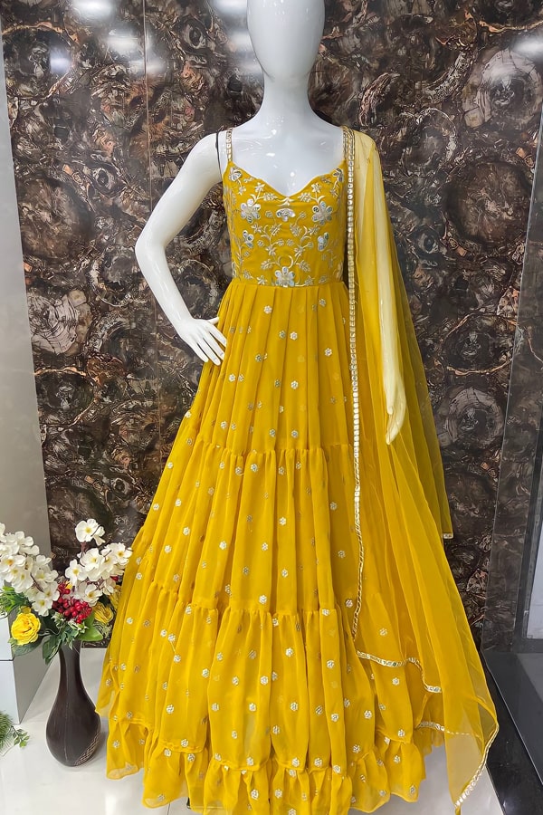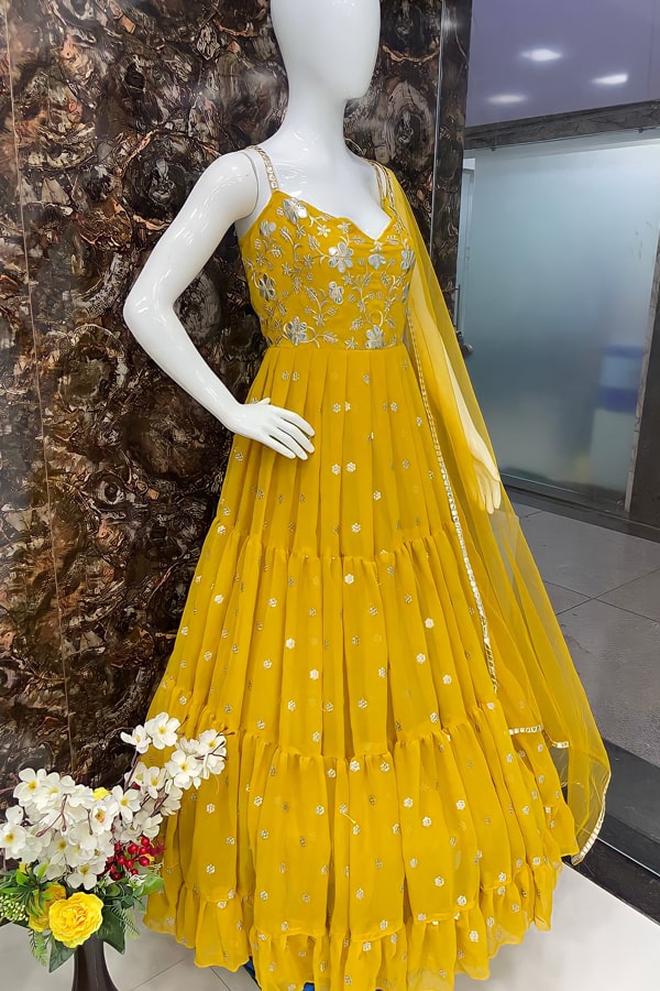 New Arrival Nikki Tamboli Yellow Gown With Dupatta Which Made With Georgette Fabric 2022