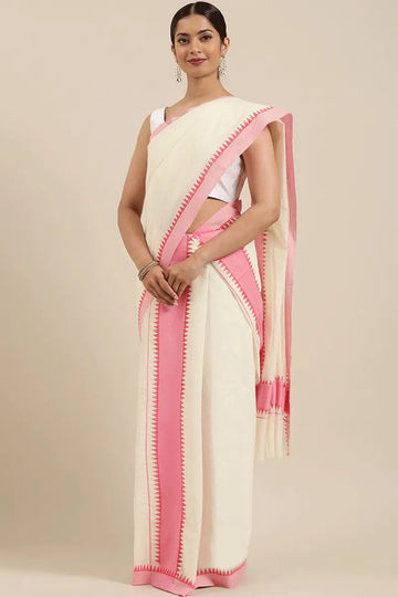 An off-white saree with a pink border is a stunning choice for a traditional look. When styling an off-white saree, you can opt for a classic and timeless look. For a traditional Kerala Onam saree design, you can consider a white or off-white saree with golden motifs or borders.
