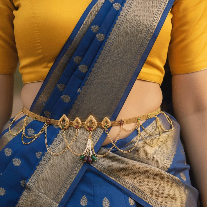 Design: Traditional South Indian–inspired kamarbandh with detailed floral motifs and elegant craftsmanship.