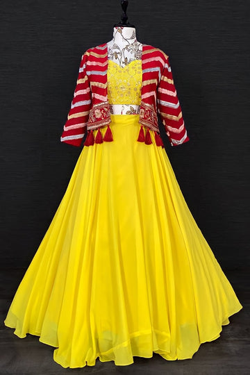 Categories: Flared Style Lehenga | Crop Top Lehenga For TeenageThis is one of the most popular lehenga designs. A lehenga choli is a crop top and skirt combination. In jacket lehengas, however, the top is replaced by a jacket or is worn on top of the original top. Lehengas with jackets are a favored ensemble by the modern, cost-conscious woman because layering is always fashionable and the jacket may be used with numerous ensembles. Jacket lehengas are perfect for women with a large upper body since they practically conceal it.Related: Latest Party Wear Crop Top Lehenga With Jacket For Wedding 2022 | Wedding Crop Top Lehenga | Crop Top Lehenga With Jacket | Embroidery Work Lehenga With Jacket | Crop Top Lehenga Design | Haldi Yellow Lehenga | Stylish Lehenga For Haldi Ceremony | Yellow Lehenga For Haldi | Yellow Bridal Lehenga