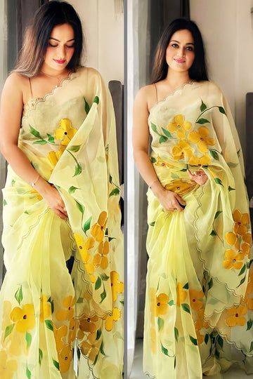 Organza is a delicate fabric that requires special care. A well-draped organza saree, on the other hand, might draw attention to your curves. This saree with intelligent floral prints has made a huge resurgence in the fashion business.