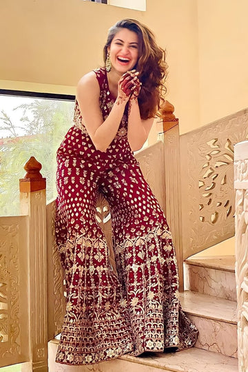 Category: Simple Dresses For Women | Designer Salwar SuitThis is a unique maroon sharara suit with a designer blouse with full embroidery work and an ombre dupatta that is perfect for flaunting effortlessly. The design of this set is exclusive and is decorated with heavy embroidery and adornment made from luxurious aari-tari material. Keep the jewelry and makeup minimal to balance out the design.Related: Party Wear Punjabi Sharara Suit Design 2022 | Party Wear Sharara Suit | sharara suit for wedding| Party Wear Sharara Suit | Pakistani Sharara Suit | Designer Sharara Suit For Wedding | Red Sharara Suit | Georgette Sharara Suit | Heavy Sharara Suit Design