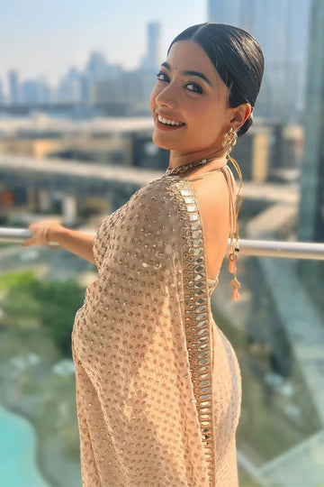 Pushpa 2 Actress Rashmika Mandanna Cream Color Party wear Saree