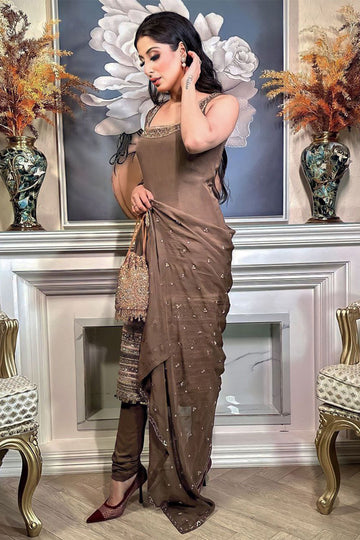 Anaya Designere Studio New brown colour Latest Raksha Bandhan Dress For Womens That Comes With Beautiful Satin Silk Fabric And Thread And Sequence Work Design.