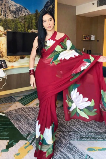New Arrival Floral Digital Print Work Ready To Wear Red Color Saree For Farewell Party