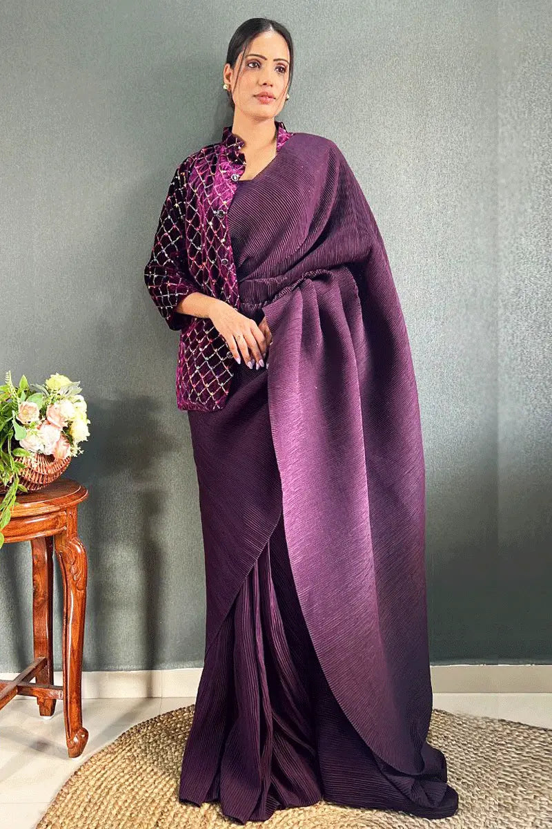 New Arrival Ready To Wear Farewell Special Wine Color Saree With Embroidery Sequins Work Jacket Online Shopping