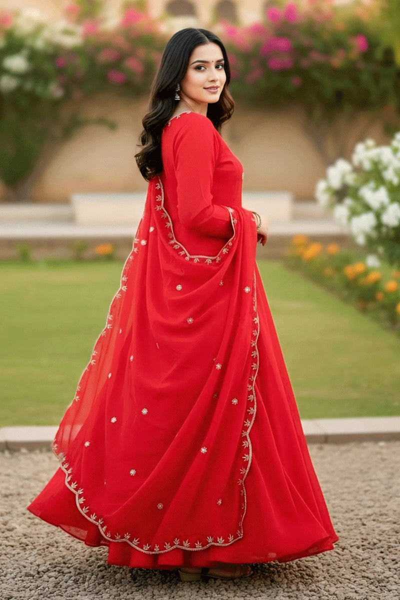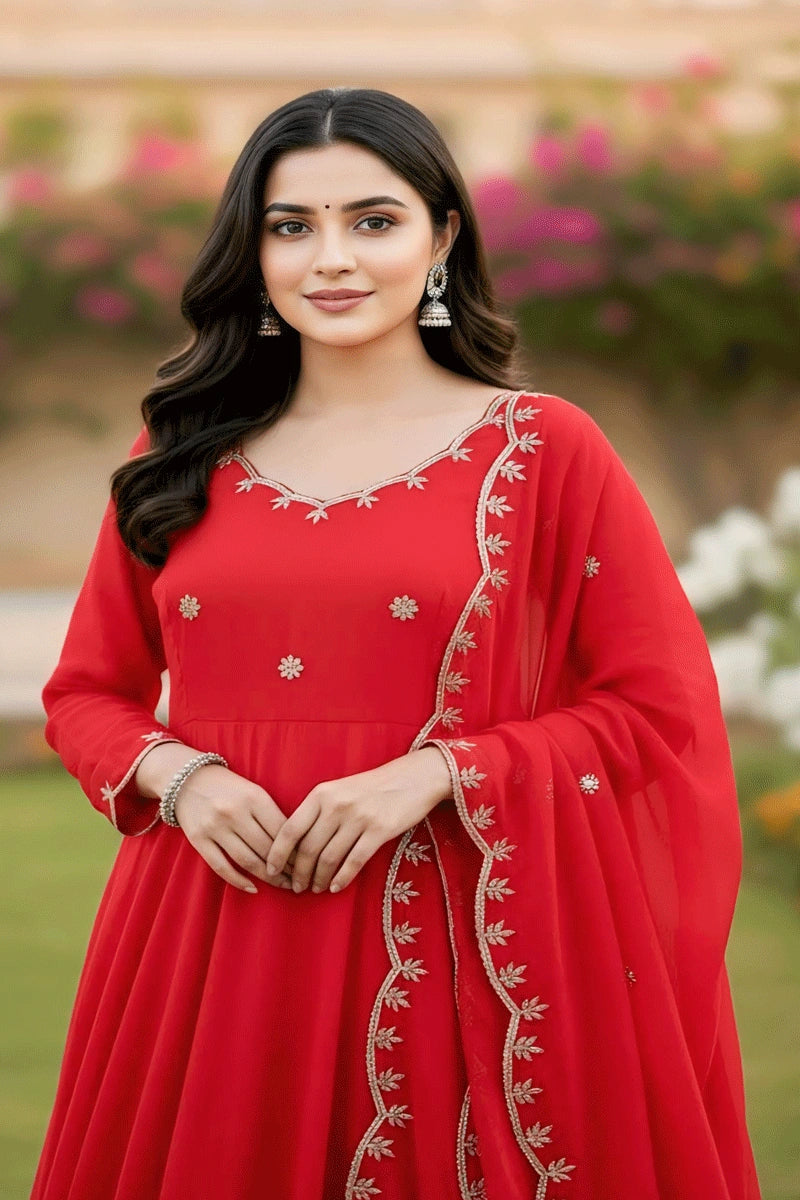 Red Color Long Sleeves Dress For Karwa Chauth Festival