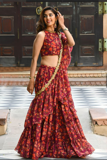 This gorgeous lehenga-saree has certainly piqued our interest, and the floral motif on the top is also a distinctive one in its own right. This saree seems to be an excellent choice for any party gathering, wedding, or engagement ceremony you could attend. The ruffle makes the whole ensemble seem like it might be worn as a lehenga. If you believe that you are capable of pulling off a hue like this, then this shade is the perfect complement to your complexion. You really need to try on this lehenga saree that is already finished.