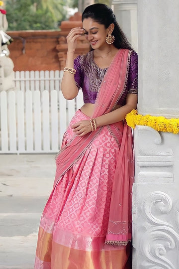 New Arrival South Indian Wedding Half Saree Designs Online For Shopping Which Made With Kanjivaram Silk Saree And Zari Weaving Work Design.